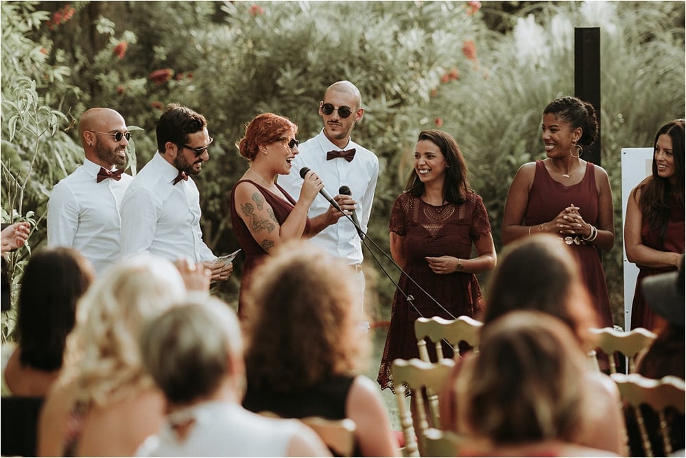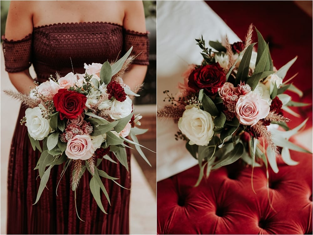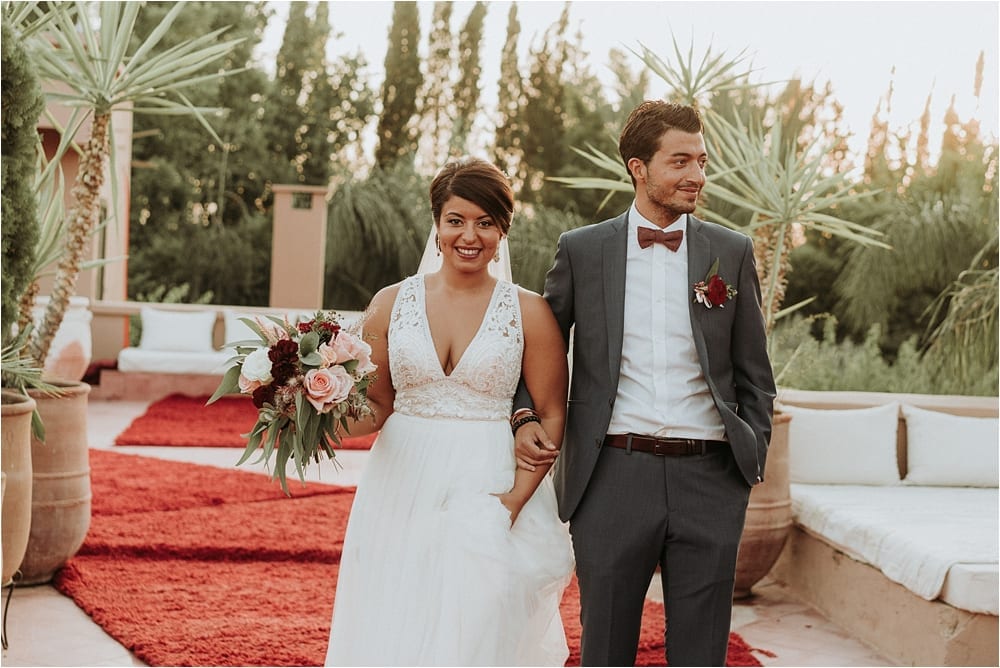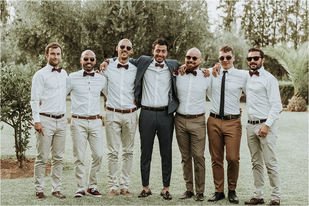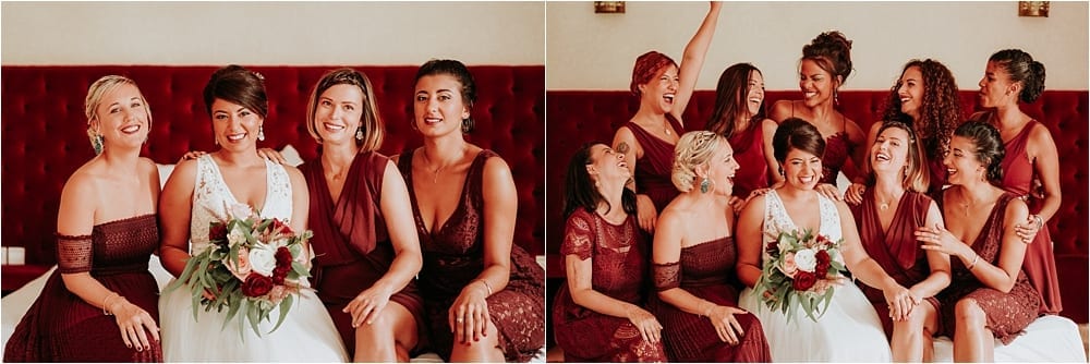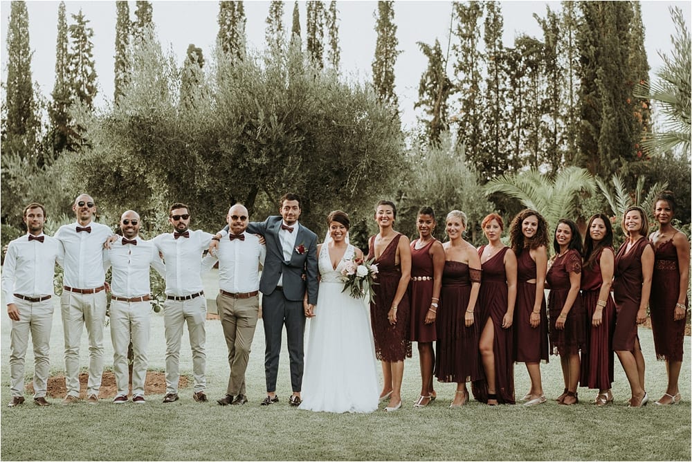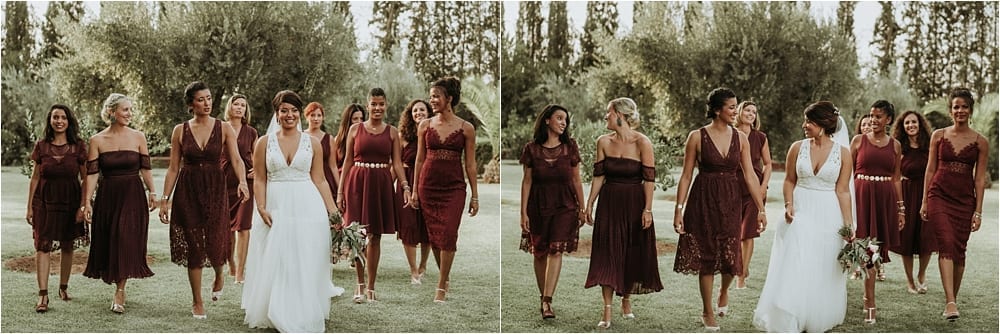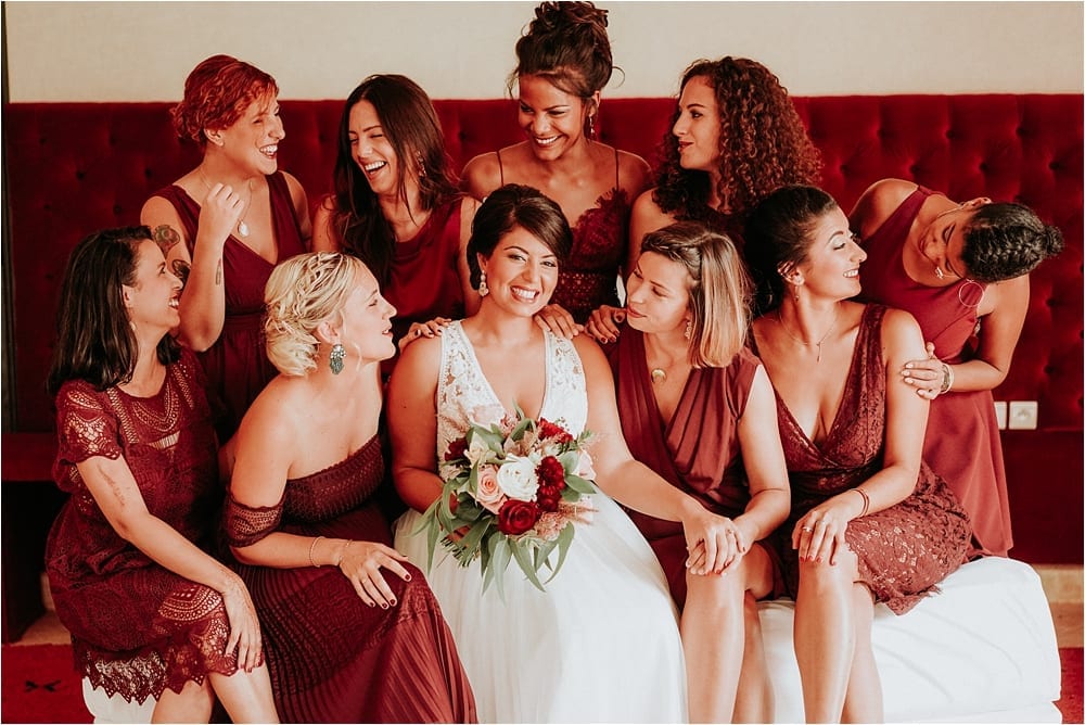 Trendy wedding colors burgundy and gold maids ideas, one of people’s favorite wedding colors in Morocco. Burgundy is so beautiful and perfect for either Winter, Spring or Summer and Autumn wedding. And it is definitely the right color for your this day. With warm berry hued, and romantic wine inspired, burgundy can be added with any sort of other colors and elements, It was a great Idea from the bride.